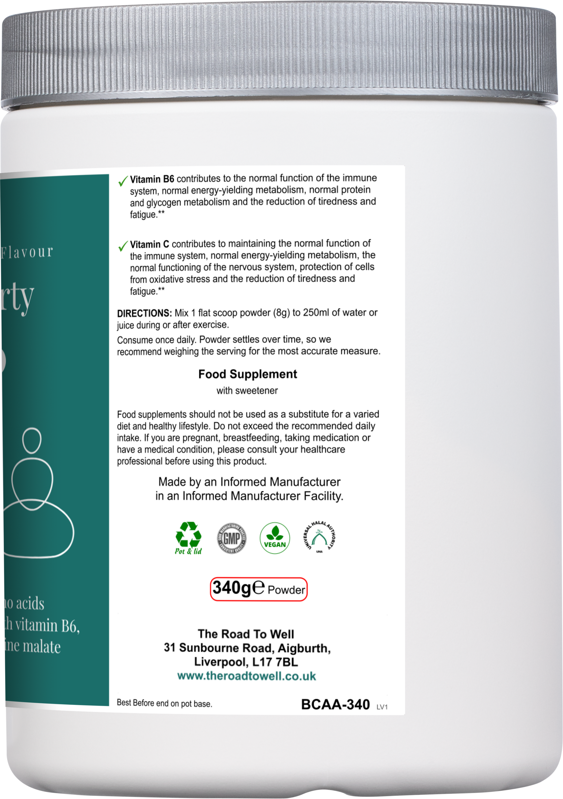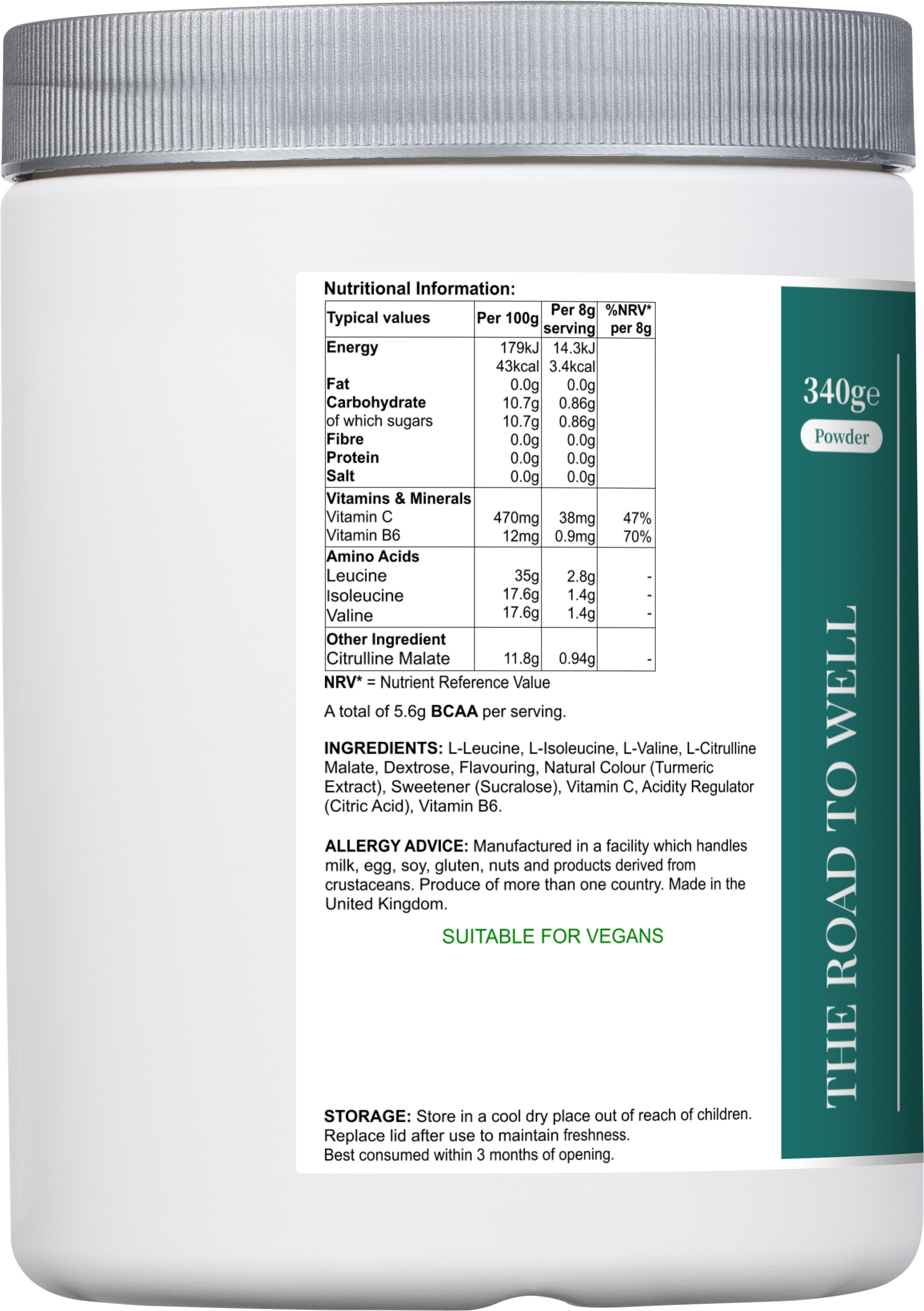 Branched chain amino acids (BCAA) drink mix, with added L-Citrulline malate, vitamin B6 and vitamin C for the reduction of tiredness and fatigue.