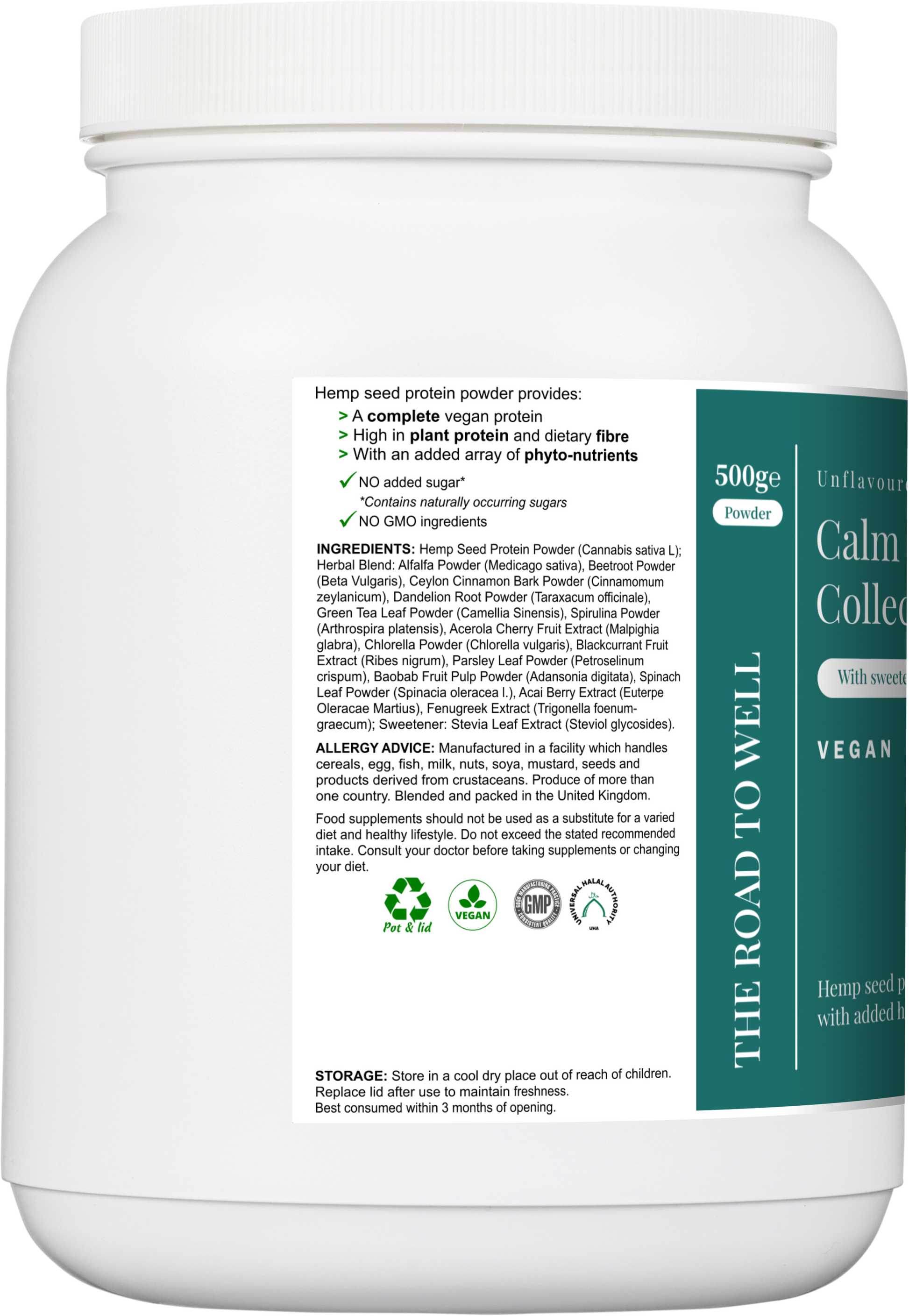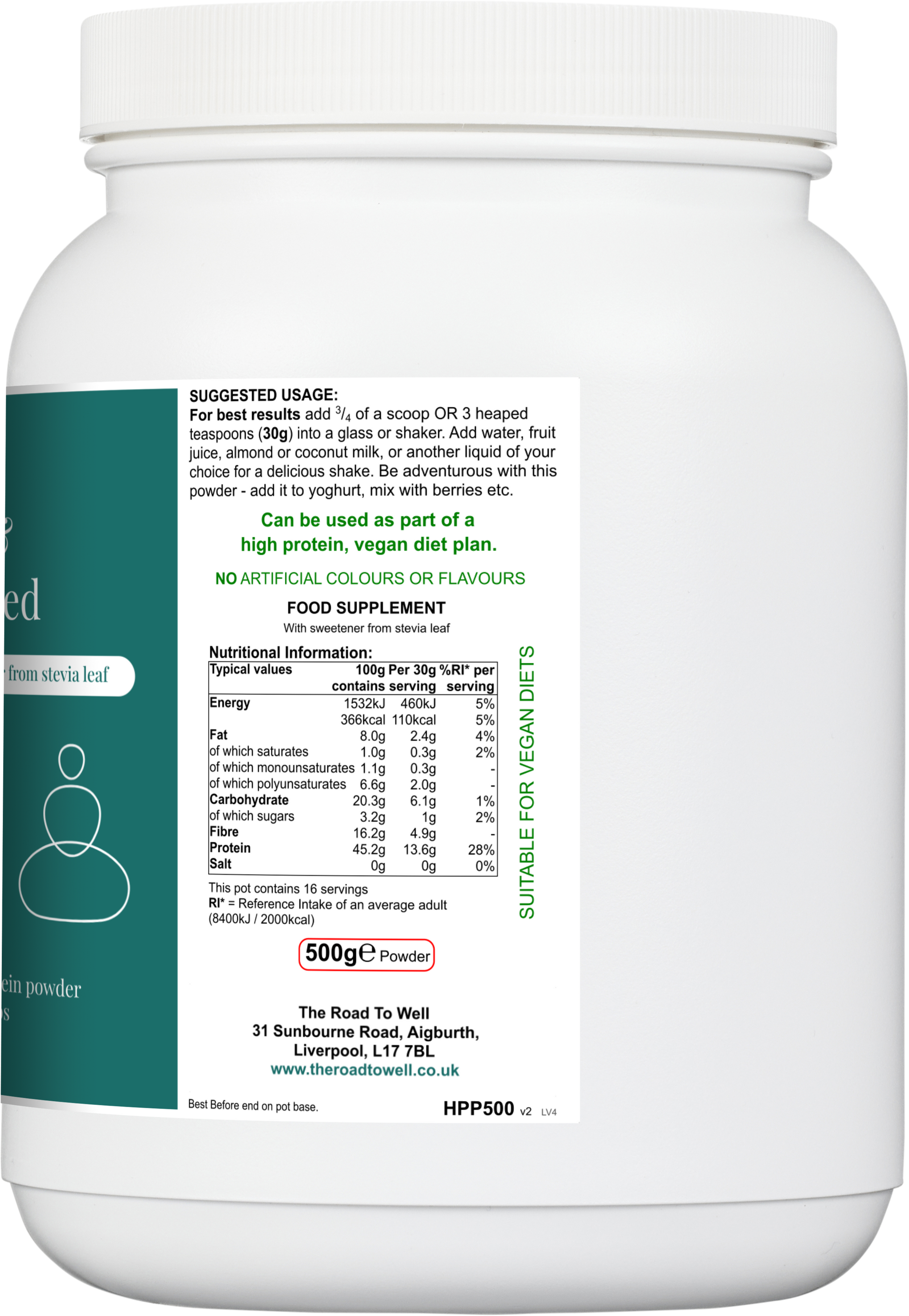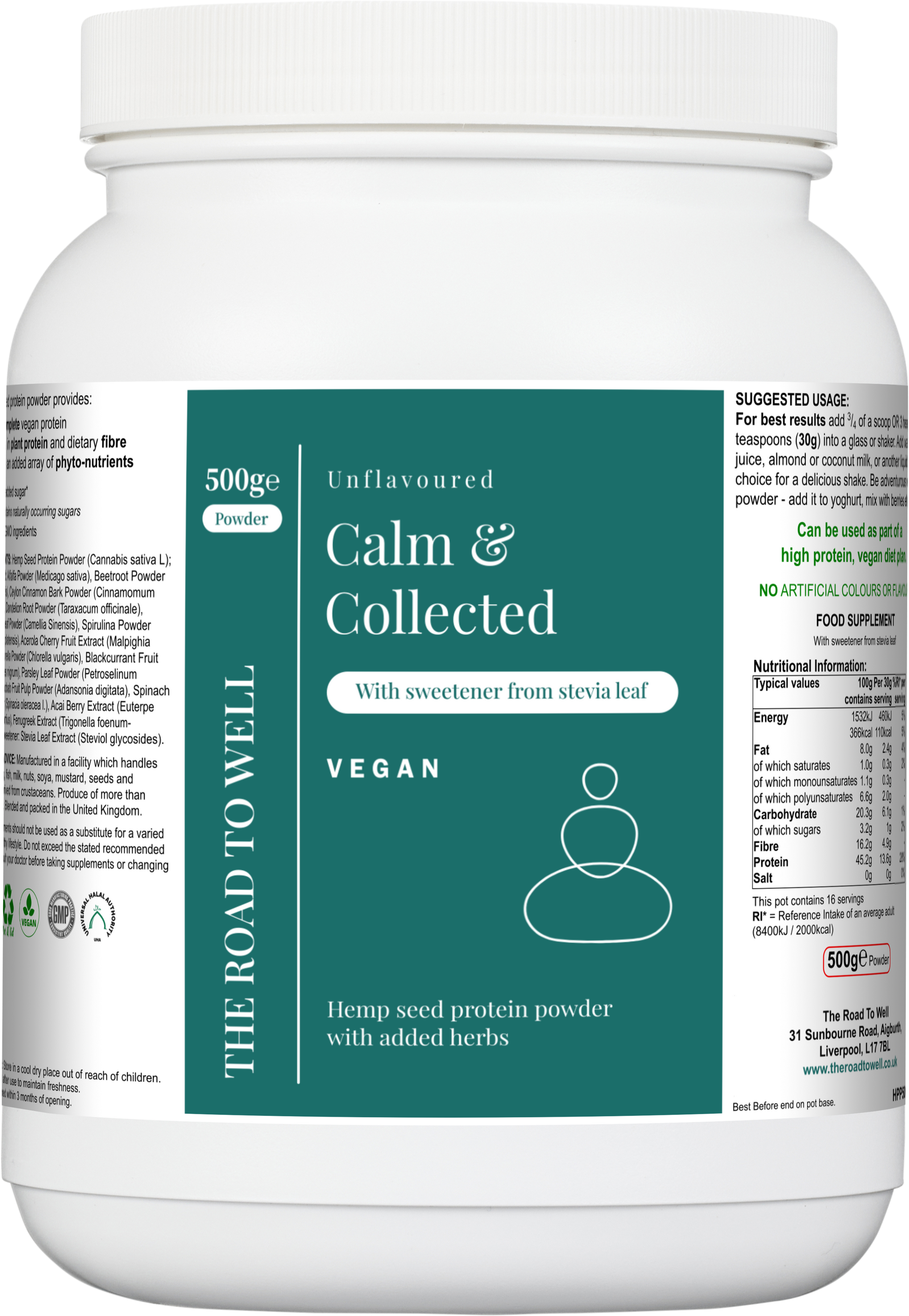 The protein in this formula is plant-based protein from hemp seed, providing 45.2g per 100g. Hemp seed provides complete plant proteins (all essential amino acids), making it an excellent alternative to animal protein.