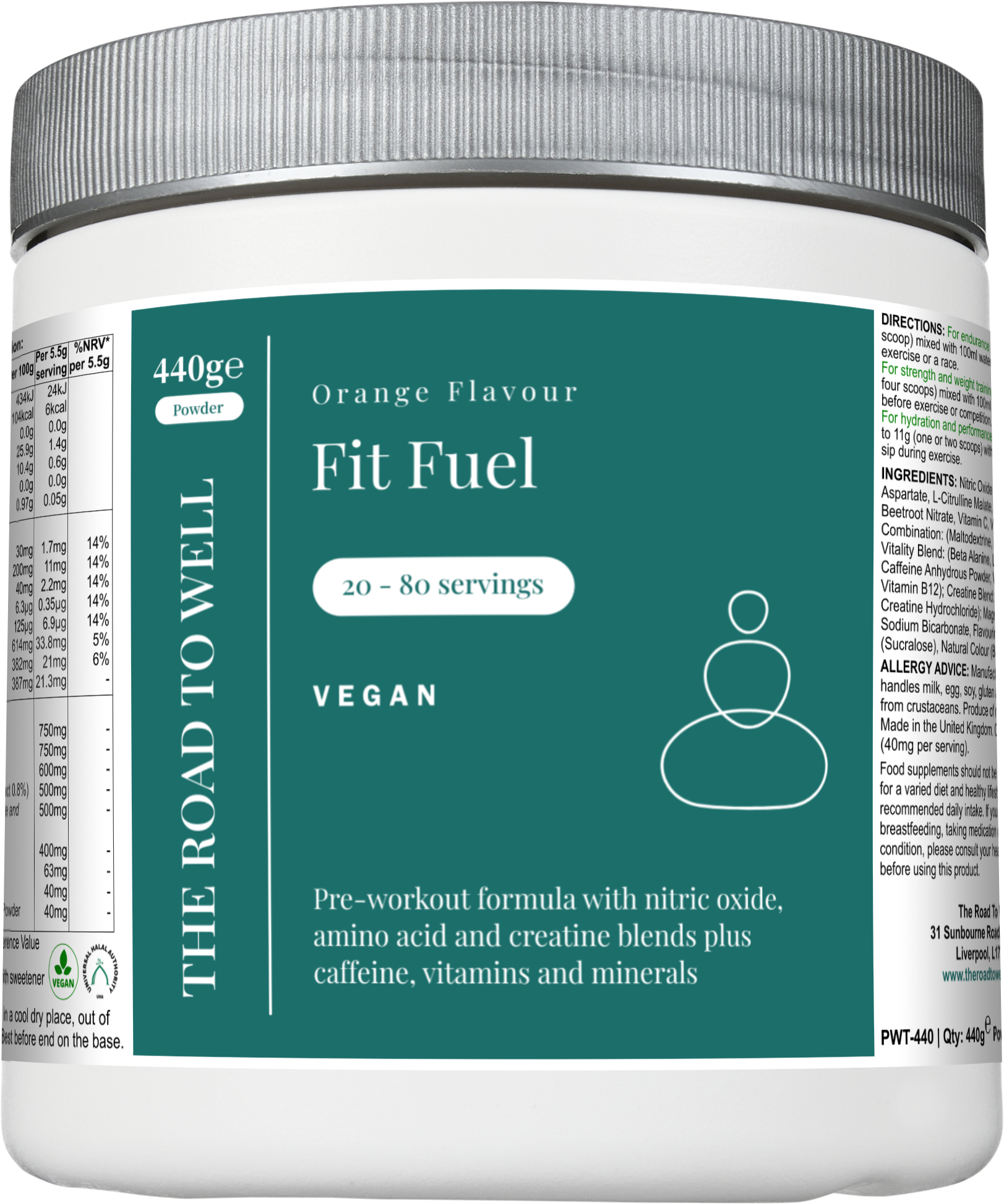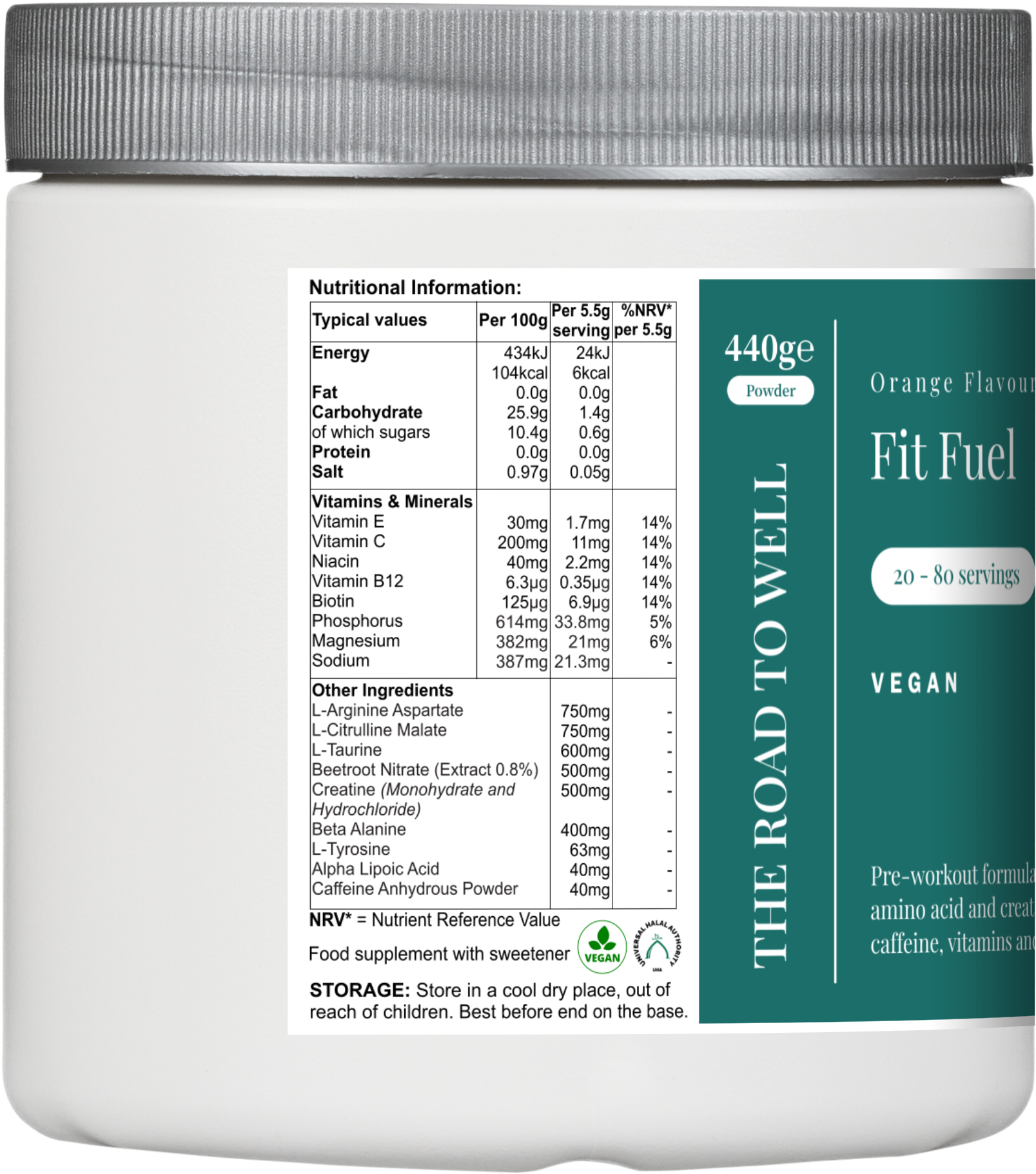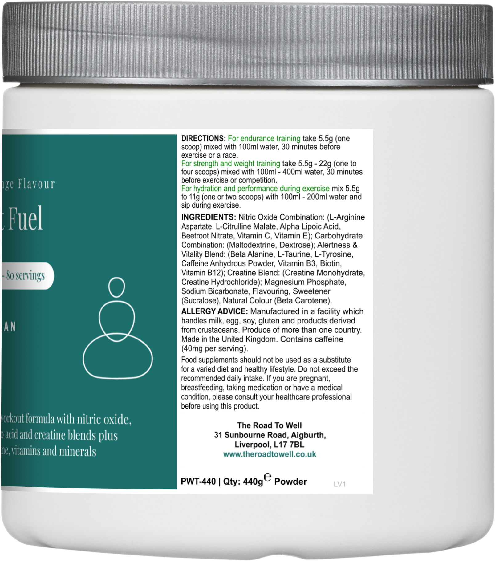 Pre-workout drink with nitric oxide, amino acid and creatine blends plus caffeine, vitamins and minerals (orange flavour)