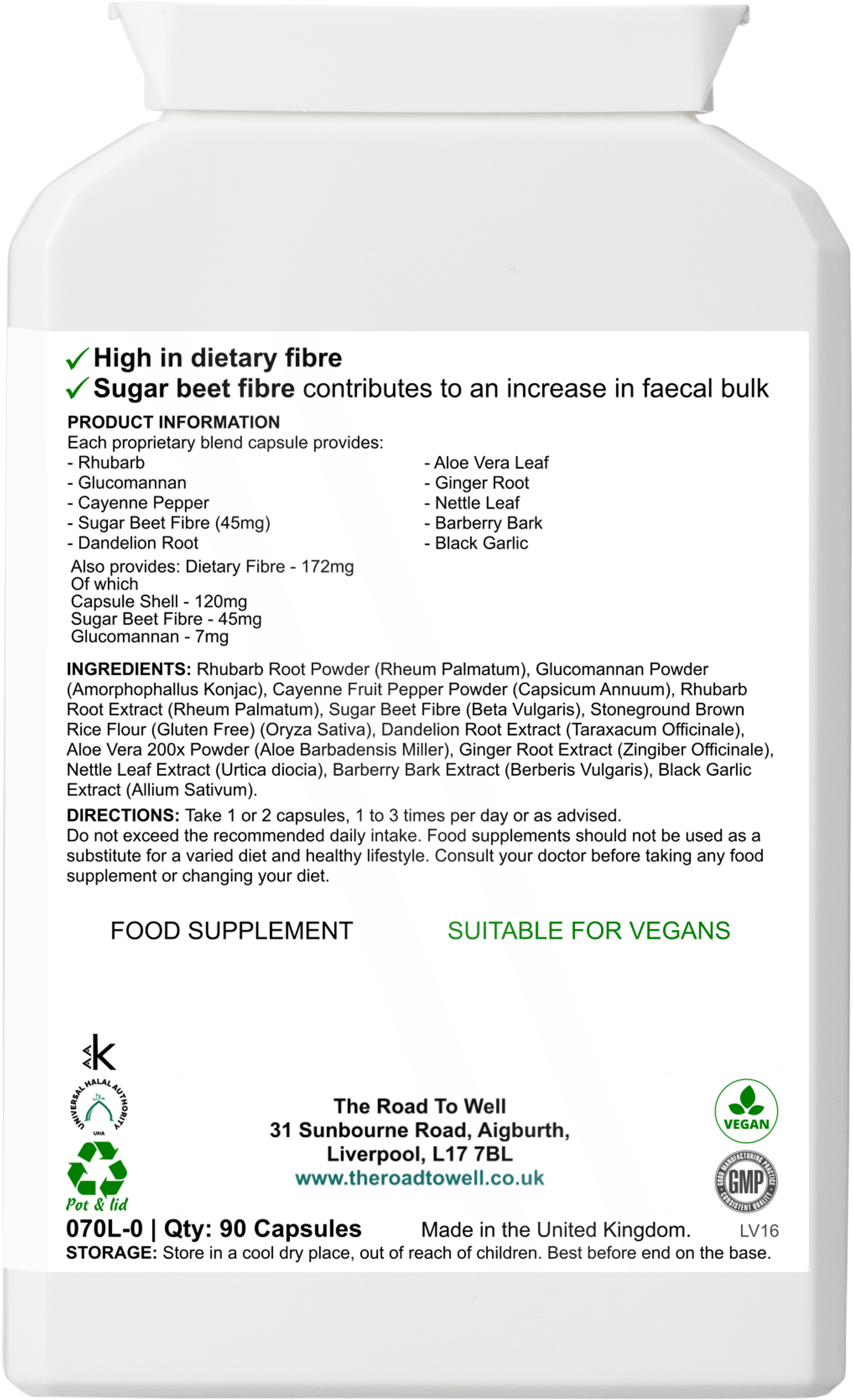 A herbal colon cleanser with a combination of sugar beet fibre (for support of faecal bulk) and specially selected herbals.