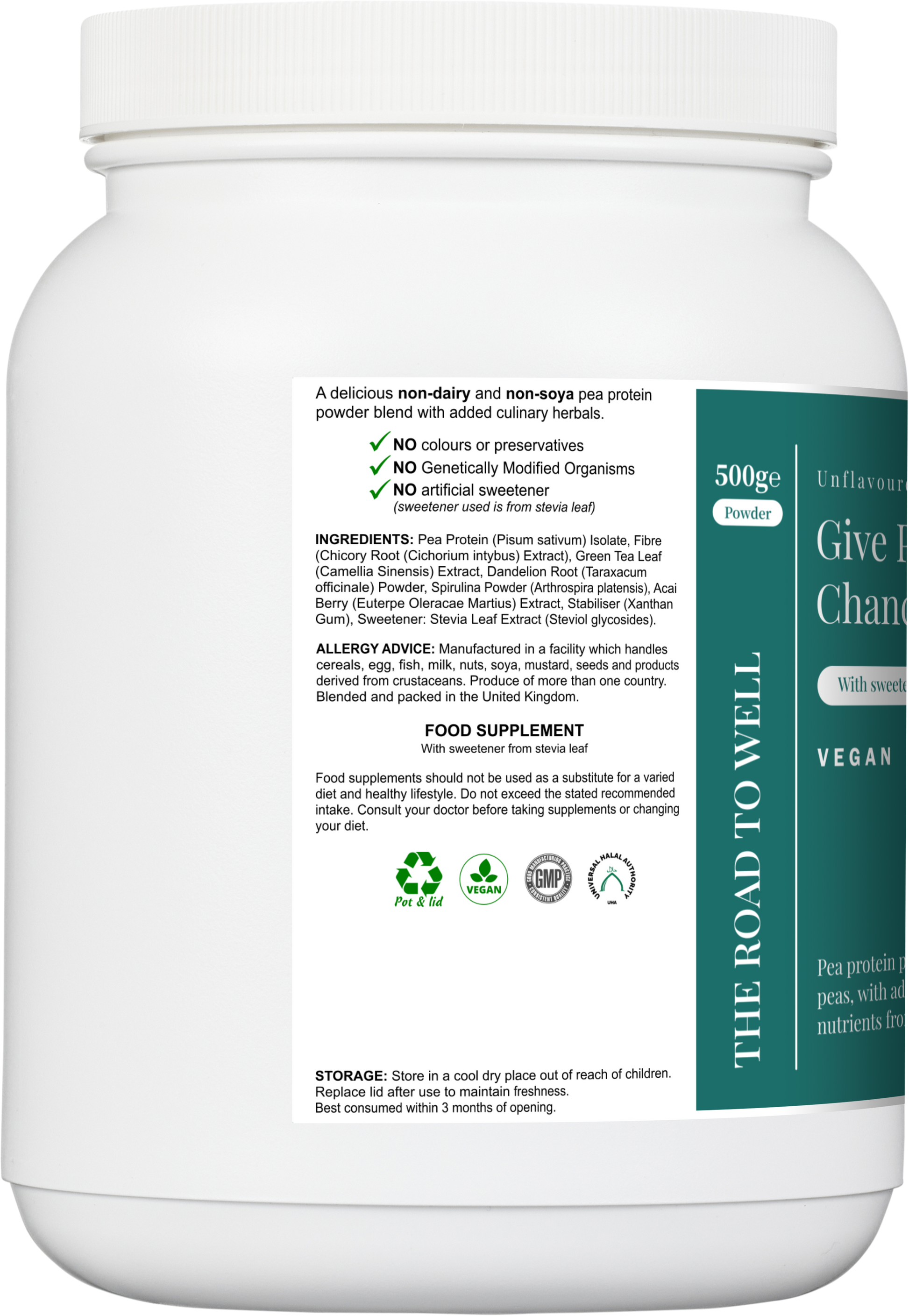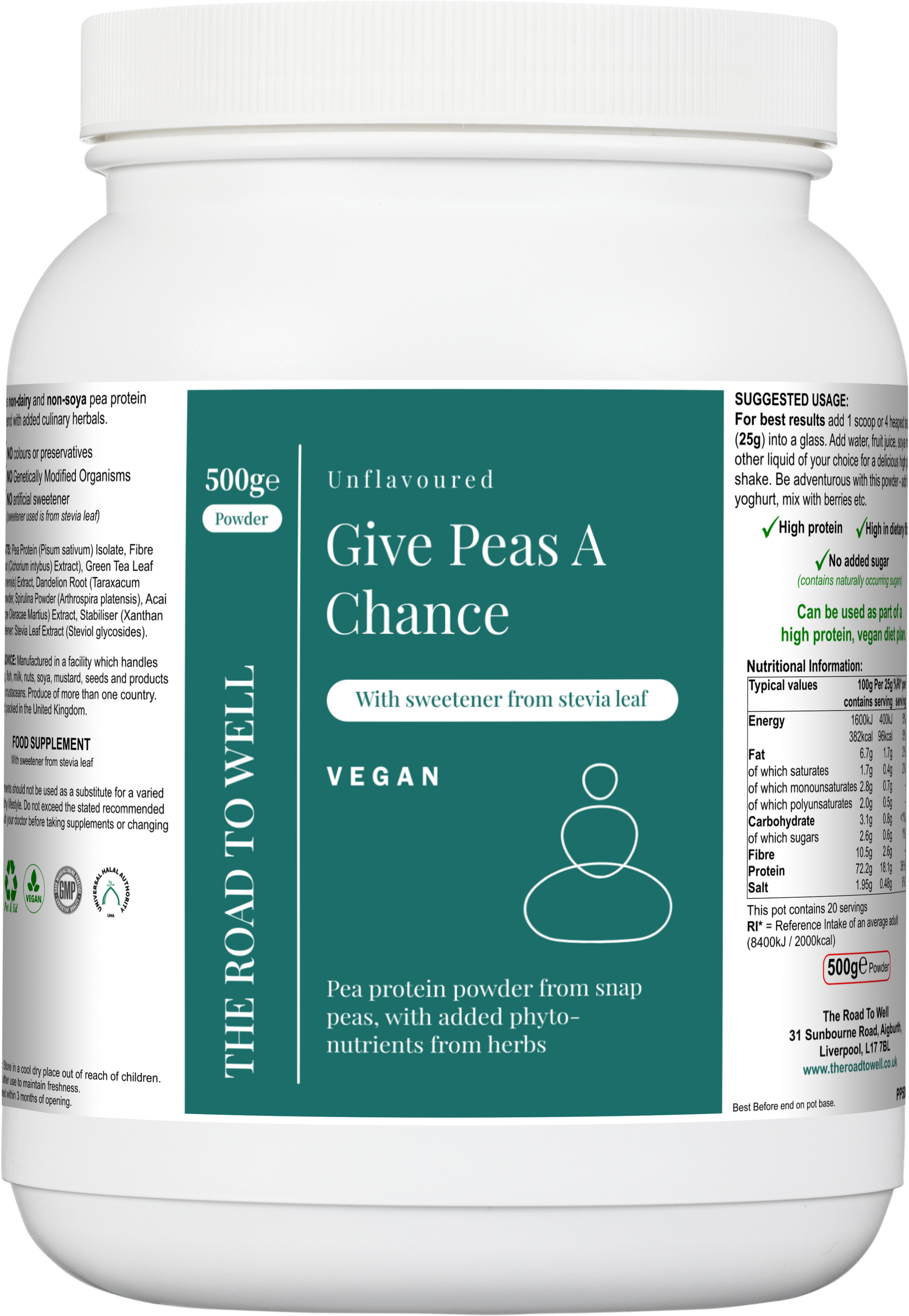 A high-quality pea protein powder (from snap peas), blended with a range of other nutrient-dense foods and herbs for added fibre and phyto-nutrients.