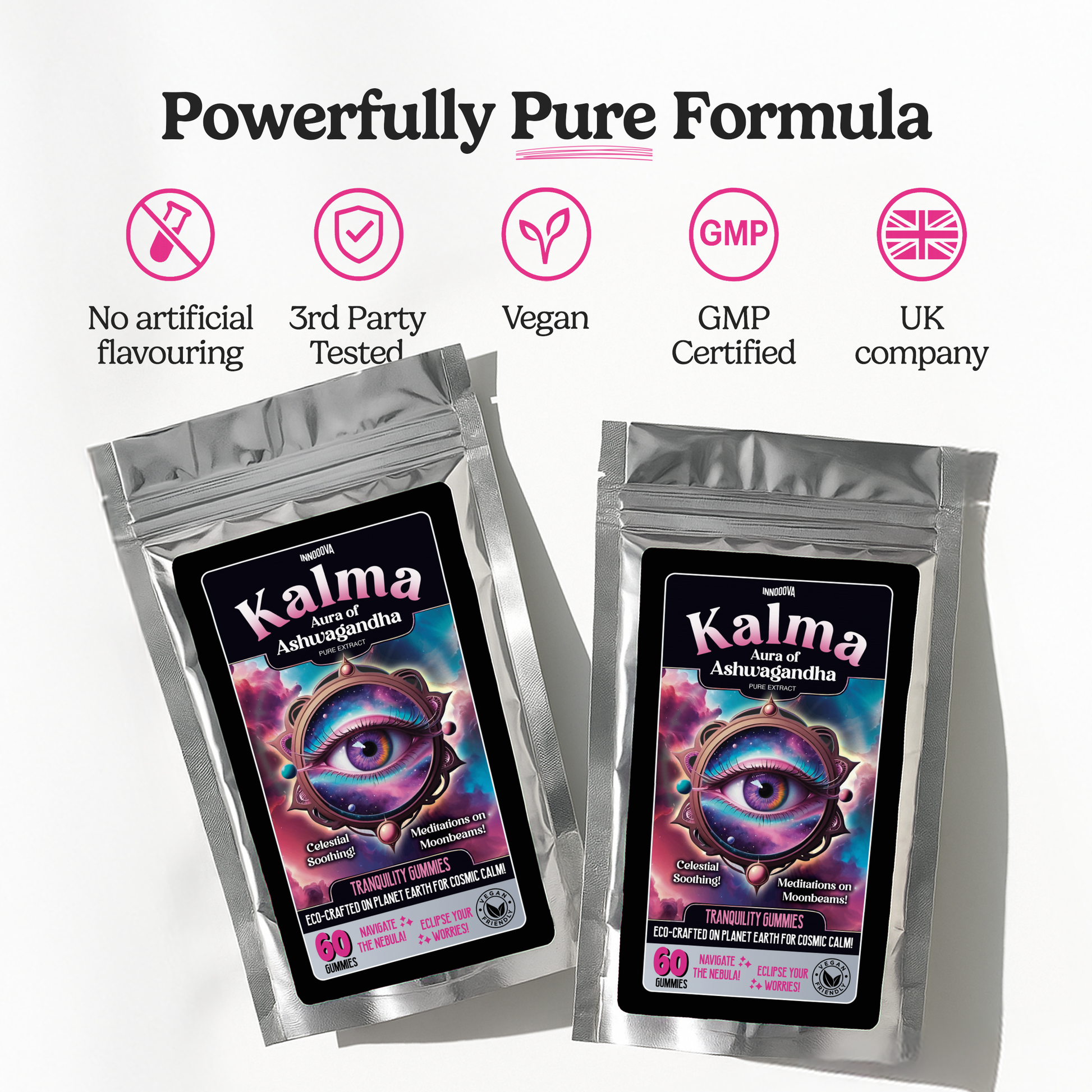- Vegan & Pectin-Based - Unlike other ashwagandha gummies that use animal-based gelatine, Kalma is made with pectin from fruit peels, making them a tasty and animal-friendly choice