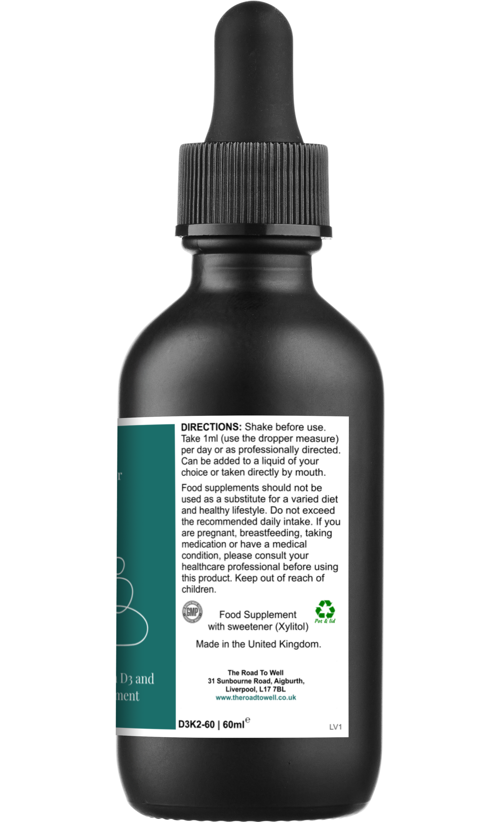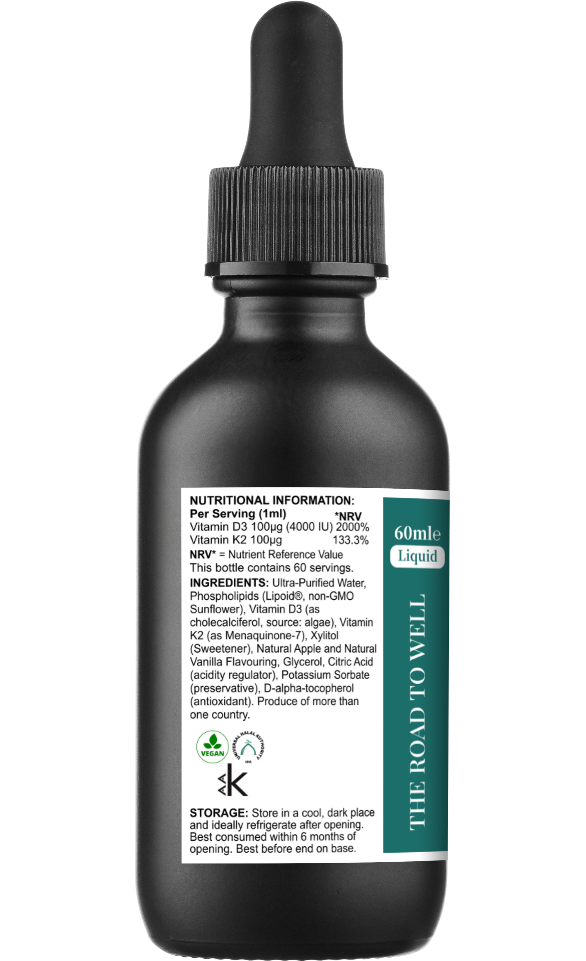 A high strength vegan liposomal vitamin D3 and K2 liquid supplement, which provides vitamin D3 4000IU (cholecalciferol) and vitamin K2 100μg (Menaquinone-7 (MK-7), a highly bioavailable form of vitamin K).