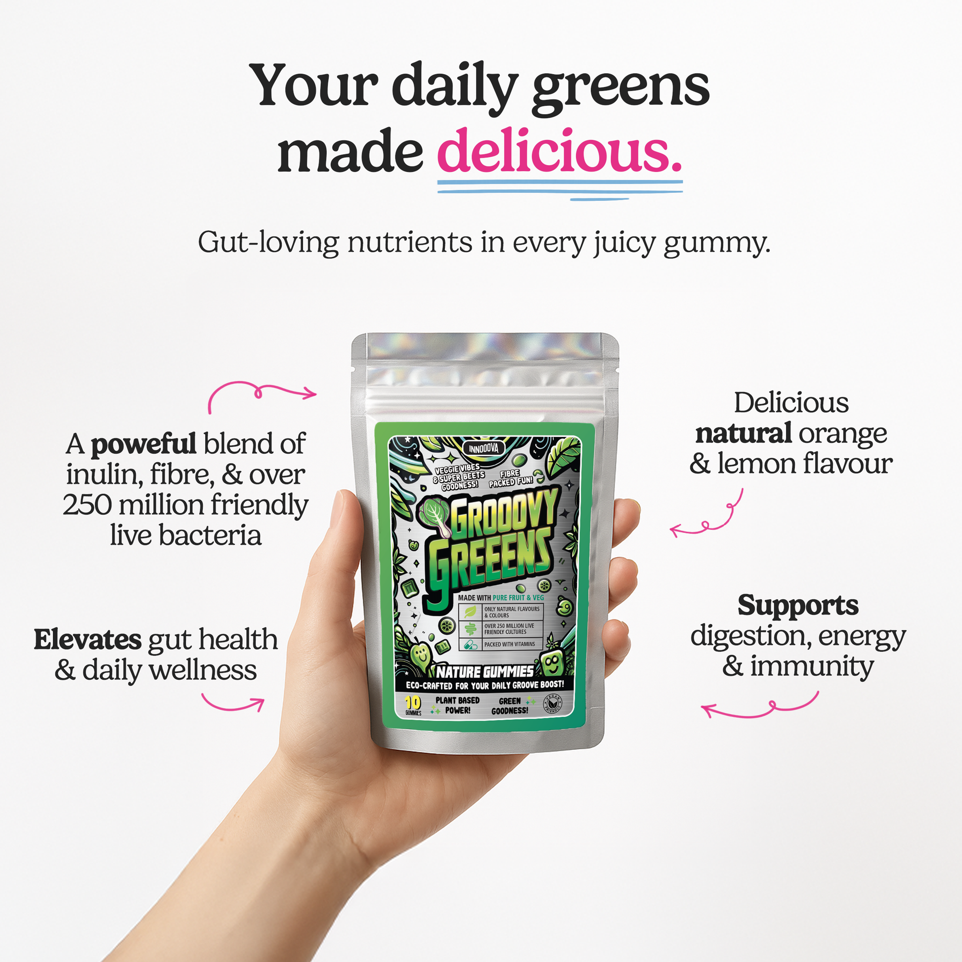 - Grooovy Greeens Gummies Each gummy is a blend of fruits, veggies, fiber, and 250 million friendly cultures. Say goodbye to bloating and support your digestion with these delicious, nutrient-packed greens.