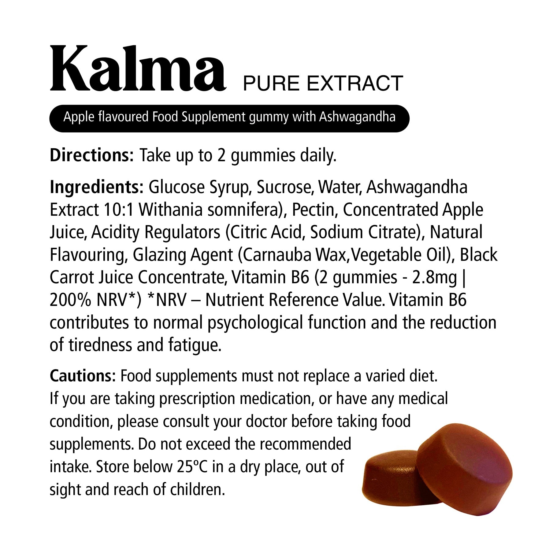 - Kalma Pure Ashwagandha Extract Gummies Made with 3000mg of pure Ashwagandha extract per serving, Kalma helps you keep calm under pressure, lower cortisol, and promote relaxation. A daily dose of chill, packed into one yummy gummy!