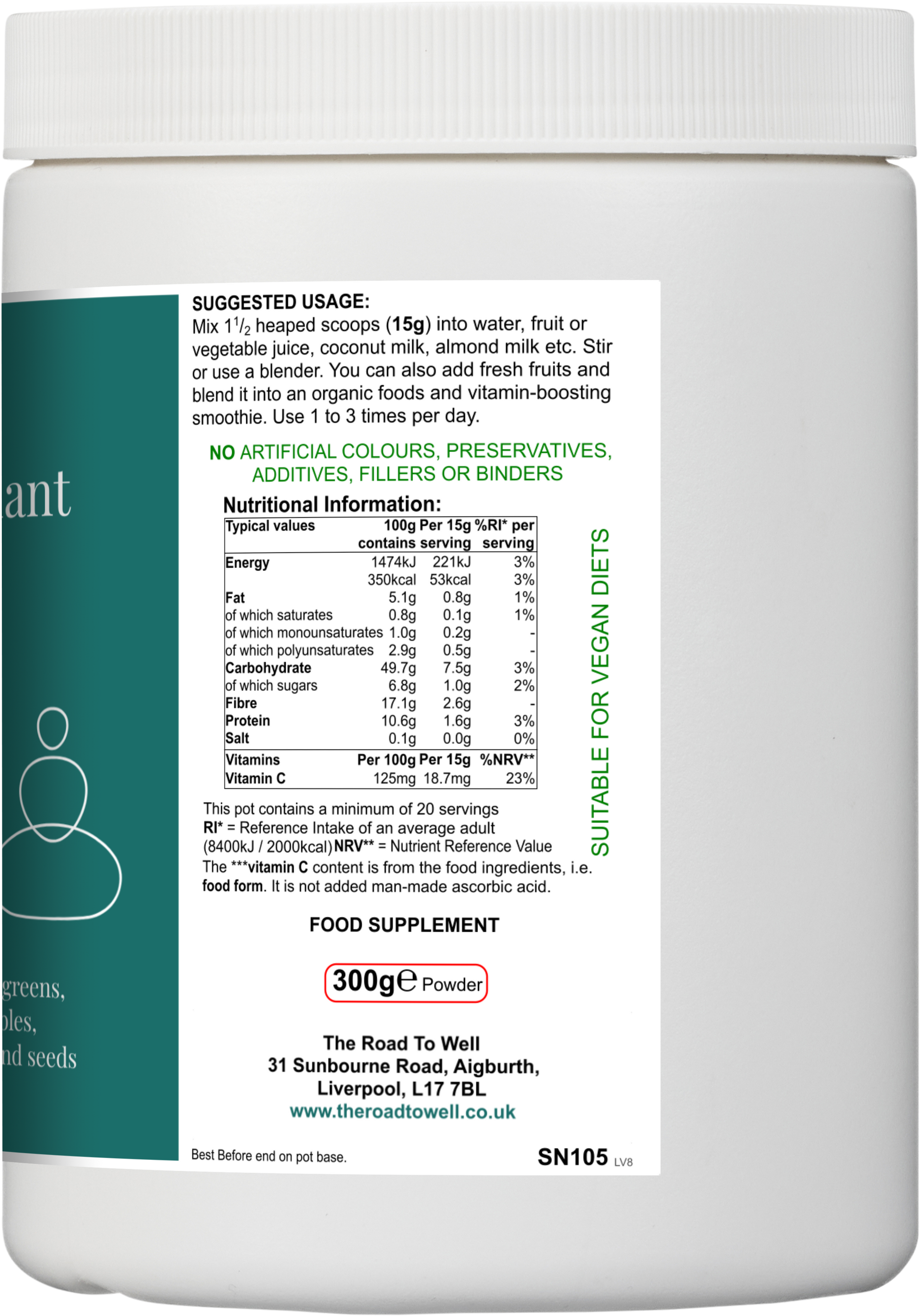 GreeNourish Complete is our flagship product and a best-seller… A high-fibre organic superfoods shake and lean plant protein powder, with over 35 nutritious ingredients, including: greens, algae, vegetables, fruits, berries, herbs, mushrooms and seeds in each and every serving – daily organic vegan nutrition made easy, with naturally high food form vitamin C content.