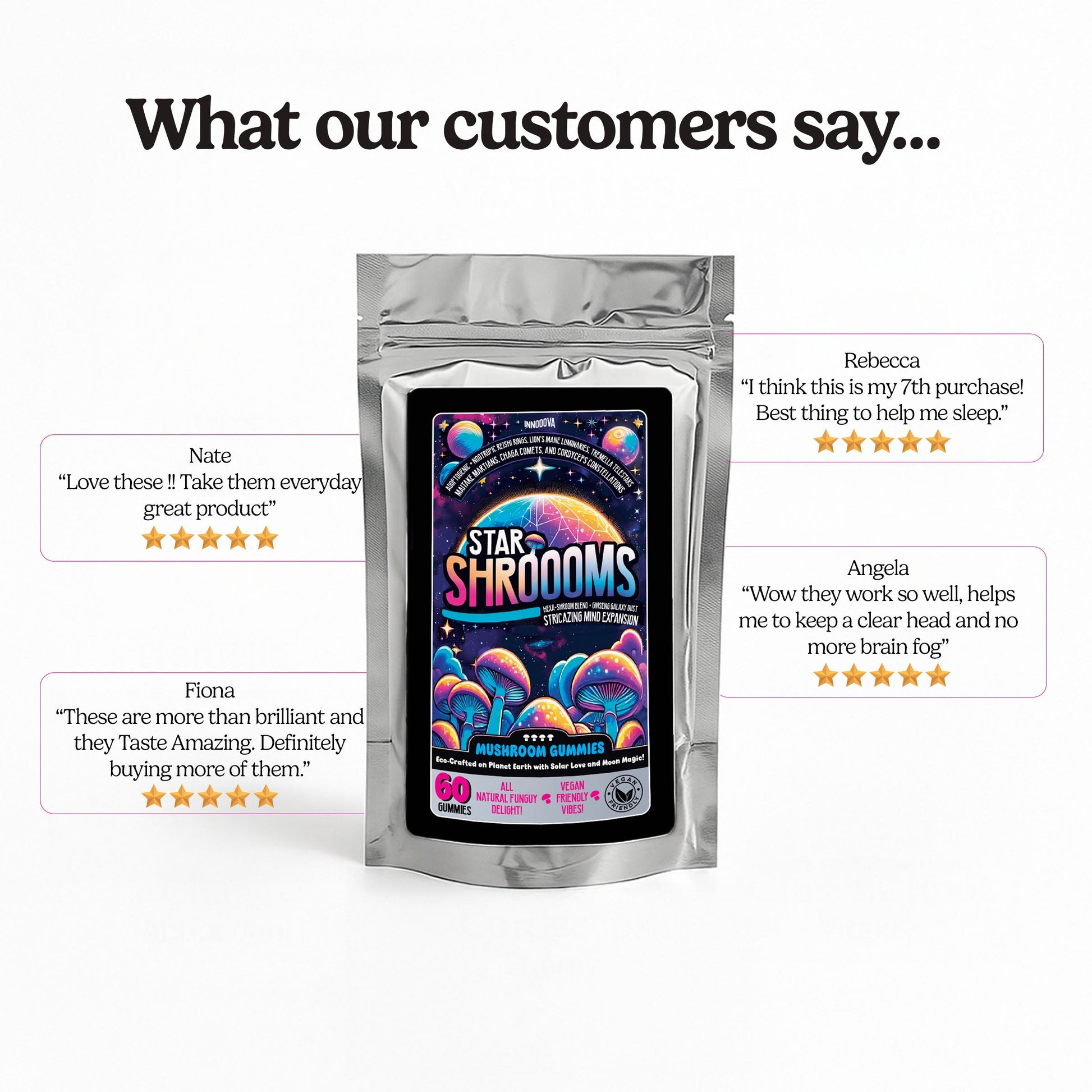 Starshroooms Gummies were crafted with a clear mission: to provide a healthful, nootropic, and adaptogenic alternative to mushroom coffee beverages that are often laden with unwanted caffeine.